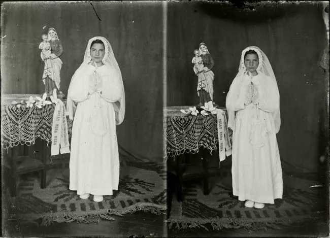 Imagen digitalizada a partir de negativo en placa de vidrio de formato rectangular y disposición horizontal. Composición en base a paisaje urbano visto desde altura. Se observa la esquina de un asentamiento urbano rodeado por un cerco de tablas de madera. Frente al cerco, una calle de tierra. A la izquierda, un poste de tendido eléctrico cuyos cables cruzan horizontalmente la imagen.