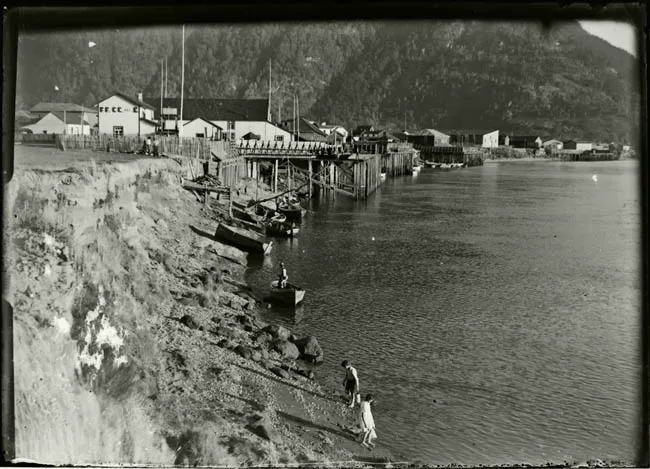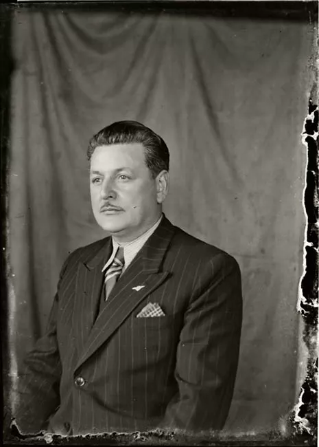 Imagen digitalizada a partir de negativo en placa de vidrio de formato rectangular y disposición horizontal. Composición de formato vertical en base a figura femenina sedente, en posición de perfil hacia la derecha con rostro girado en tres cuartos hacia el frente y mirada hacia la cámara. La figura tiene ambas manos entrelazadas alrededor de una rodilla. Está ubicada al centro de la imagen, en primer plano. La figura tiene el cabello rizado, peinado hacia atrás y atado en un moño. El cabello de alrededor del rostro de la figura es de un tono más claro que el resto de su cabello. La figura tiene los ojos de tono claro y maquillados. También lleva labial de tono oscuro. Sobresale una línea dura que contornea el labio superior y que es de un tono más claro que el labial. En su lóbulo derecho se observa un pendiente de tono claro, con una forma circular en la parte superior de la cual se desprenden cuatro cadenas compuestas de tres figuras circulares cada una. Además, viste dos brazaletes metálicos en su muñeca izquierda.