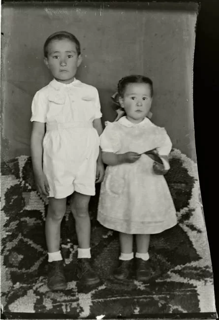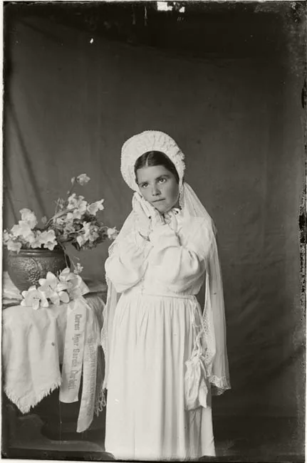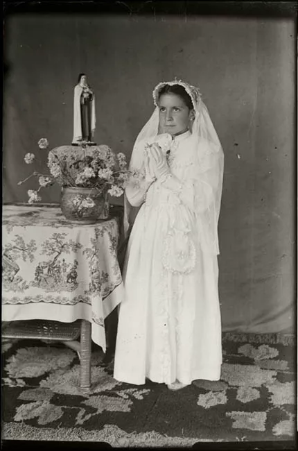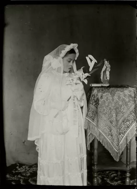 Imagen digitalizada a partir de negativo en placa de vidrio de formato rectangular y disposición vertical. Composición en base a medio cuerpo de figura adulta femenina ubicada al centro de la imagen, en primer plano. La figura se encuentra de pie, en posición tres cuartos hacia la izquierda con la cabeza y mirada hacia la cámara y ambos brazos cruzados frente al torso. Tiene el cabello oscuro, corto hasta la altura de la mandíbula y rizado. El cabello está peinado hacia la izquierda y tomado en la parte superior de la cabeza. La figura tiene los ojos de tono claro, ligeramente maquillados y ocupa un labial de tono oscuro. Se observan pequeños pendientes circulares y un anillo metálico en su dedo medio izquierdo. Viste un atuendo compuesto por un bolero de manga larga y falda de la misma tela de tono oscuro. El bolero tiene un detalle de cordón oscuro que rodea con volutas los bordes de la prenda. Bajo el bolero, una blusa blanca con cuello redondo y vuelos. En el fondo, un telón liso.
