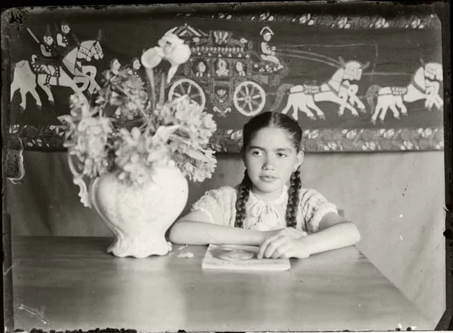 Imagen digitalizada a partir de negativo en placa de vidrio de formato rectangular y disposición horizontal. Composición en base a medio cuerpo de figura femenina que sostiene entre sus brazos a una figura masculina infantil. Están ubicados al centro de la imagen en primer plano.