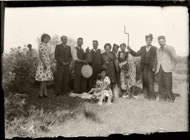 Imagen digitalizada a partir de negativo en placa de vidrio de formato rectangular y disposición horizontal. Composición en base a cuerpo entero de siete figuras posando para una fotografía. Cinco corresponden a figuras infantiles y dos a figuras adultas. Se encuentran al centro de la imagen, en una fila. De izquierda a derecha.