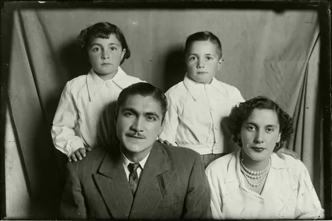Figura masculina adulta sedente sobre silla. Lleva encima, sentada sobre su regazo, una figura infantil. Ambos miran a la cámara. La figura masculina tiene la frente amplia y el cabello corto y oscuro. Viste camisa blanca y corbata, traje y zapatos en tono oscuro. Usa anteojos. La figura infantil que lleva encima tiene el cabello oscuro en melena corta. Viste suéter en tono gris con dibujos en el canesú. Una prenda en tono claro que lleva abajo tipo falda o delantal, pantalones largos en tono gris y zapatos oscuros y cerrados en sus pies.
