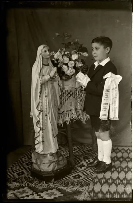 Figura masculina de cabello oscuro, corto y peinado hacia atrás. Usa bigote. Viste traje negro con pañuelo en tono claro en el bolsillo superior. Además usa camisa blanca y corbata negra en tela brillante.