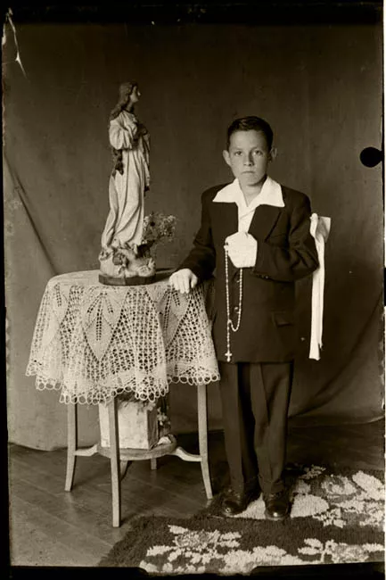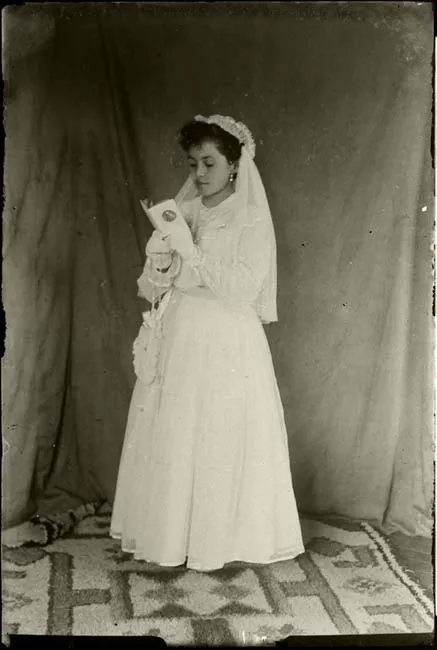 Imagen digitalizada a partir de negativo en placa de vidrio de formato rectangular y disposición vertical. Composición en base a tres figuras masculinas en el marco de una puerta, hacia la calle. De izquierda a derecha: