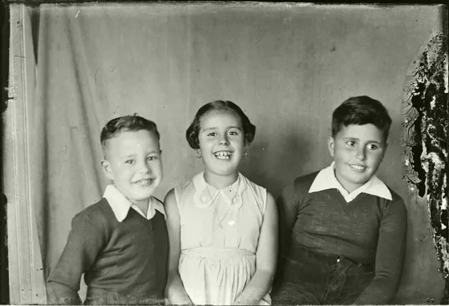 Imagen digitalizada a partir de negativo en placa de vidrio de formato rectangular y disposición horizontal. Composición en base a medio cuerpo de tres figuras infantiles sedentes, cada uno sobre una silla de madera individual, y tras una mesa con mantel en tono oscuro con diseño. Están ubicadas al centro de la imagen.