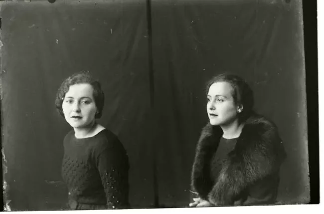 Imagen digitalizada a partir de negativo en placa de vidrio de formato rectangular y disposición vertical. Composición en base a cuerpo completo de dos figuras, una femenina y otra masculina, ambos de pie. Están ubicados al centro de la imagen, en primer plano.
