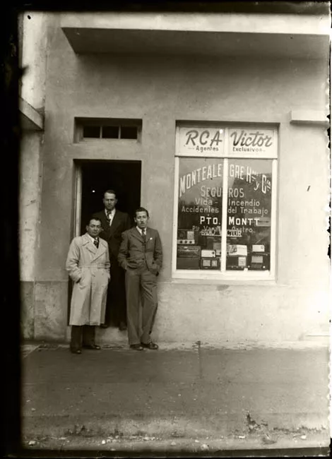Tres hombres frente una tienda