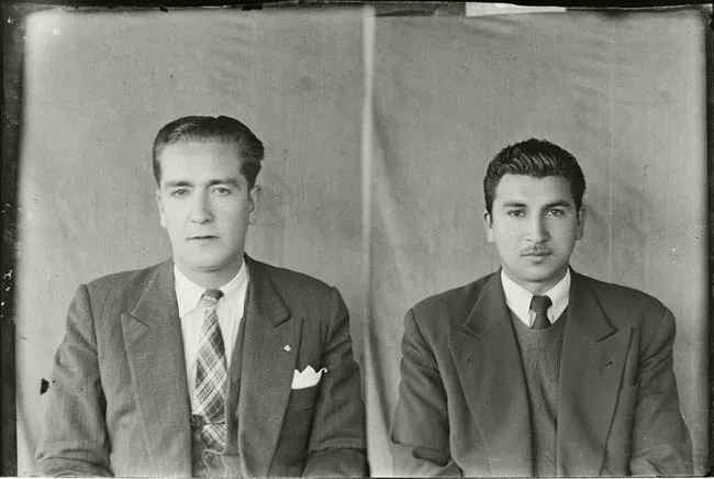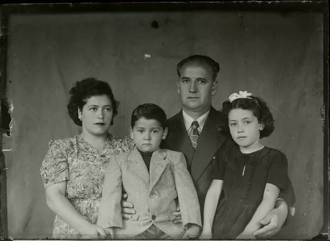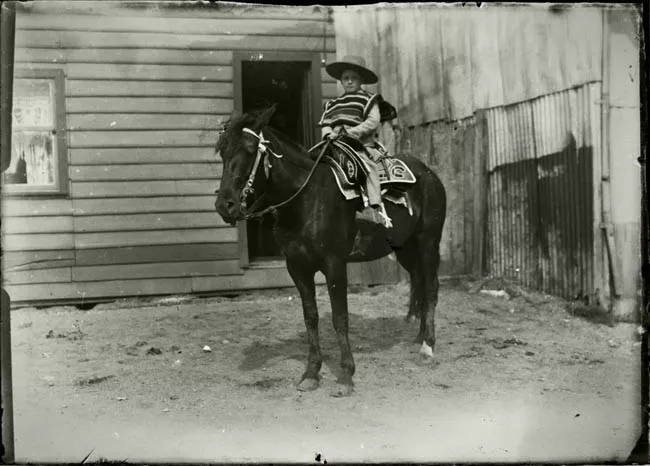 Imagen digitalizada a partir de negativo en placa de vidrio de formato rectangular y disposición horizontal. Composición en base a cuerpo completo de figura infantil recostada. La figura se encuentra en posición vertical, con los pies hacia la cámara y la cabeza hacia el fondo. La figura tiene abundante cabello oscuro, ondulado y revuelto. Viste un conjunto de medias y cárdigan tejidos de tono gris. El cárdigan tiene tres botones a la vista. La figura tiene ambos brazos levantados. Se encuentra sobre una piel de animal de tonos claros y medios. En el fondo, una mesa de madera cubierta con un mantel blanco y botellas blancas sobre este. A la izquierda de la mesa, una madera de forma cuadrada, presumiblemente un respaldo de cama. Tras la mesa y la madera, un muro cubierto con papel mural.