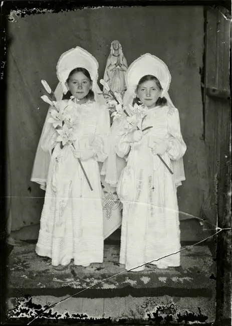 Imagen digitalizada a partir de negativo en placa de vidrio de formato rectangular y disposición vertical. Composición en base a figura de niño de pie, de cuerpo entero y medio perfil hacia la izquierda. Esta ubicado al centro de la imagen, en primer plano. Lleva el cabello corto de color oscuro. Viste traje oscuro con pantalón largo, zapatos negros, camisa y guantes blancos. En su brazo izquierdo lleva cinta de color blanco que en una franja tiene escrito: "Helmuth Subiabre Cardenas" y en la otra franja "RECUERDO DE MI PRIMERA COMUNIÓN" seguida por otra frase ilegible. Entre sus manos sujeta un libro pequeño. La figura está sobre una alfombra, de color oscuro con diseños en tonos claros, con la mirada puesta en el libro. Al fondo un telón en tonos grises.