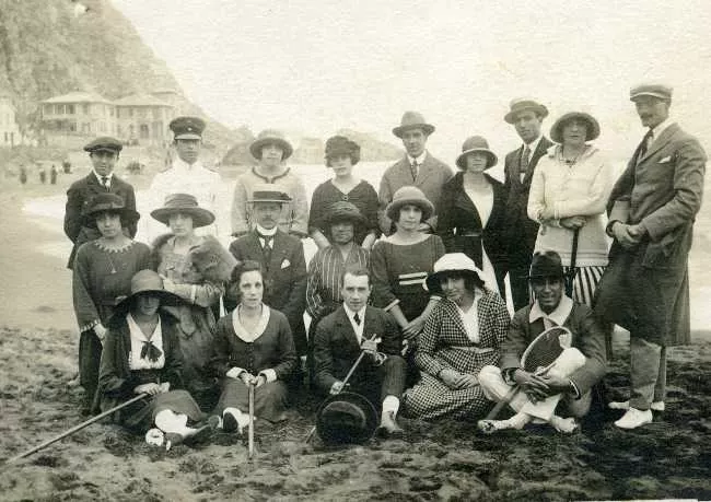 Retrato de damas y caballeros en playa de Constitución