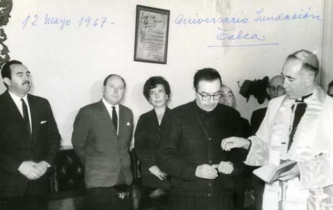 Objeto rectangular, color sepia. Imagen de un grupo de personas y vehículos teniendo como fondo un paisaje cordillerano.