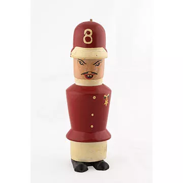 Juguete que se utiliza en conjunto con una lienza. Objeto compuesto por una base apuntada y cilíndrica, cuerpo cónico marcadamente más ancho hacia la parte superior y un remate redondeado. Madera torneada de color marrón claro con una línea ancha pirograbada de color marrón oscuro.