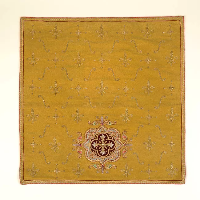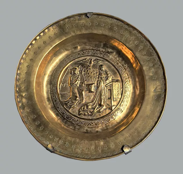 Objeto de uso litúrgico, con formato circular y aspecto metálico, de ...