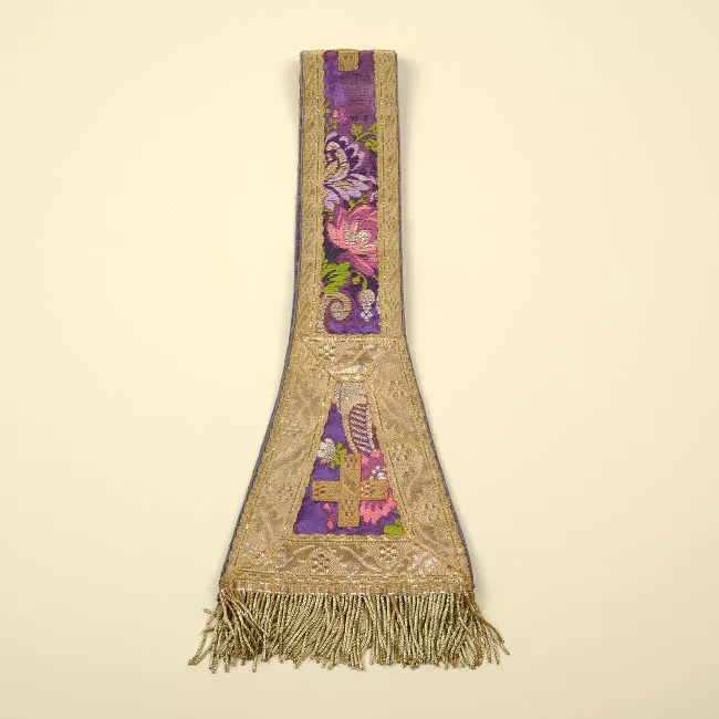 Textil cosido de seda color fucsia con bordado en hilo metálico y aplicación de galón con hilo dorado. Pieza rectangular de tela magenta; extremo inferior, aplicación de cruz en cordoncillo metálico; borde cinta dorada metálica. Reverso de color café.
