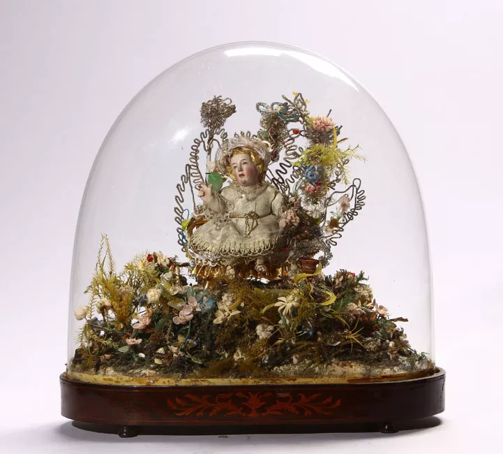 Figura infantil de bulto y talla completa, sedente, lleva el cabello...