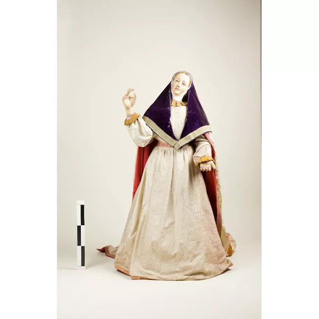 Recipiente metálico suspendido por cuatro cadenas, divido en dos partes una superior, de tapa, irregular y calada. Parte inferior redondeada sobre una pequeña base redondeada; interior pieza removible. Bronce fundición, laminado y soldadura.
