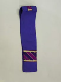 Utensilio metálico, dorado. Al extremo superior presenta un tomador formado por una figura femenina coronada, con las manos unidas sobre el pecho; ésta se eleva sobre una pieza campaniforme, extremo inferior amplio, al borde lleva dos franjas una en greca y otra perlada. Decoración, diseño de traceria gótica, con flor de lis en relive, sobre la parte superior.