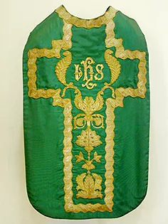 Textil de seda blanco, cosido y bordado con hilo de oro en relieve, flecos dorados, elementos metálicos añadidos y lentejuelas. Textil litúrgico de forma rectangular con cuatro caídas, de color blanco con aplicaciones doradas y grises. Cada caída está decorada con elementos vegetales compuestos por hojas y racimos de uvas y rematados en flecos ondulantes. Una de las caídas tiene un elemento decorativo central de un ave con las alas extendidas y otra de un animal echado sobre una cruz. Textil que es montado sobre varas y utilizado como dosel para cubrir una imagen durante las procesiones.