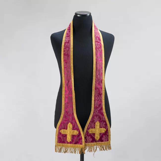Banda vaticana realizada en textil de seda cosido de dos colores y flecos, amarillo y blanca con flecos. Se utiliza en la cintura.