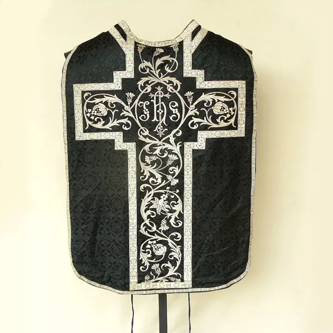 Vestimenta de tela negra, alargada y abierta a los lados. Pieza delantera pequeña y periforme, lleva aplicación central de cinta plateada, formando un rectángulo. Espalda, cinta plateada forma gran cruz, en su interior bordados plateados con motivo de flores destacan las letras JHS. Interior, tela negra.