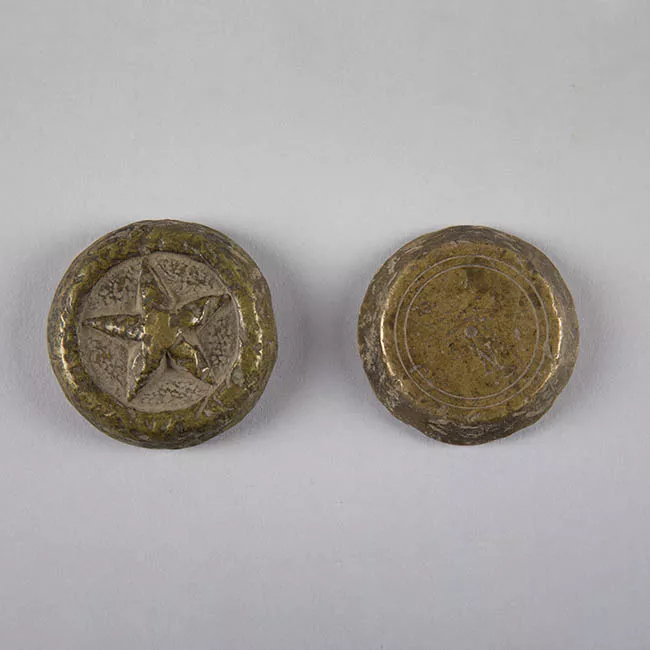 Objeto alargado de madera en un extremo es más grueso y en el otro más angosto, ambas puntas son redondeadas; es de color negro en el mango y ocre en la punta.