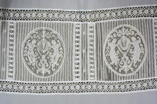 Objeto compuesto por banda rectangular con decoraciones vegetales y florales de color ocre, azul, rosado y negro. Tiene bordes con flequillo.
