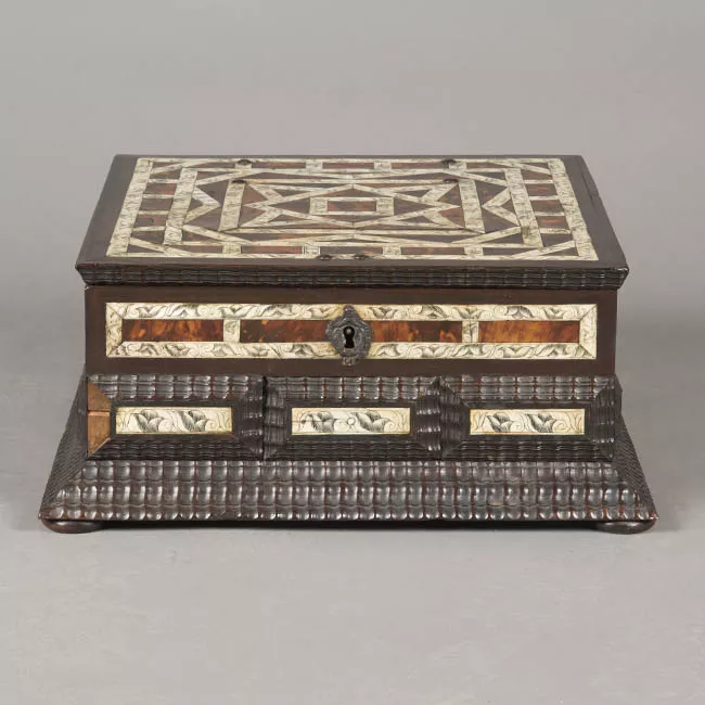 Mueble de asiento unipersonal. Compuesto por asiento y respaldo de forma cuadrada, tapizados con cuero de vaqueta estampada, de color café moro con decoraciones de animales, cuenta también con una hilera de balaustradas de madera torneadas. El tapiz de cuero va con tachones metálicos decorados. Patas torneadas en balaustre y travesaños curvos.