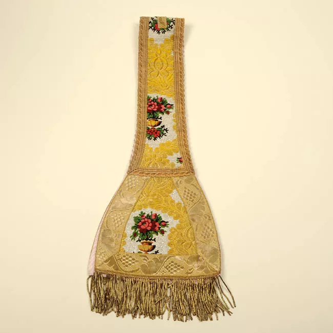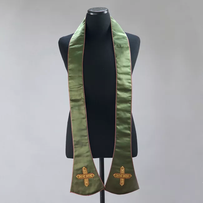 Prenda de vestir litúrgica de uso exterior, de forma oblonga. Textil cosido de forma rectangular realizado en brocado de color amarillo con figuras de flores y hojas en tono rosa. El borde de la pieza esta ribeteado por una pasamanería de color café oscuro formando figuras de zigzag y ondas. En sus extremos tiene una guarda más ancha con flecos del mismo color café. El reverso está forrado con tela de algodón de color rosa más intenso, liso.