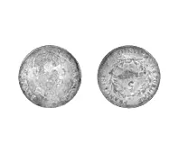 Moneda de metal plateado de formato circular. En el anverso se observa un rostro femenino de perfil hacia la izquierda y en el reverso una figura humana sedente de perfil sobre una carreta y sostenido un tridente en su mano izquierda.