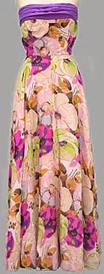 Vestido strapless confeccionado en gasa floreada de colores lila, verd...