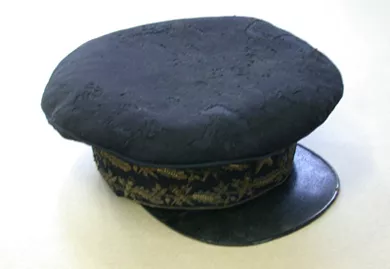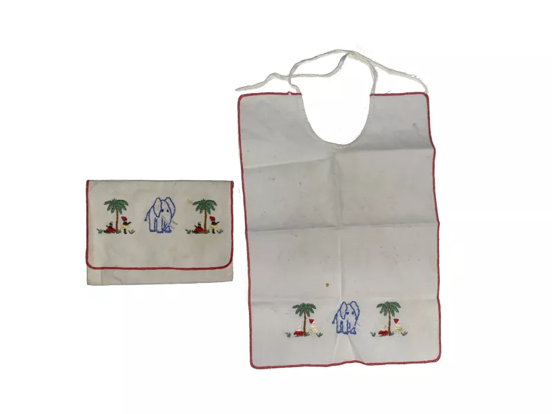 Levantador de falda, de metal plateado, con forma de pinza, llevando en los extremos dos círculos, tipo platillos, siendo uno cóncavo y el otro con un material que le da forma en relieve. En el otro extremo lleva una argolla.