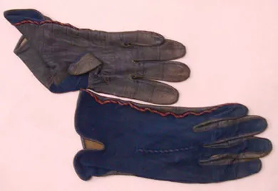 Un par de guantes de gamuza blanca con 3 costuras en la parte superior y un tajalí de 9,5 cm. que se cierra con 2 botones blencos de material sintético imitando concheperla.