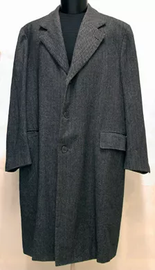 Abrigo de tweed de lana con una figura de espiga gris y negro. Abertur...
