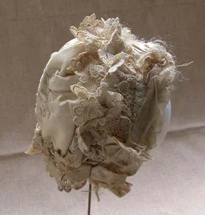 Gorro de bautizo de seda y encajes color marfil, con forma de capota c...