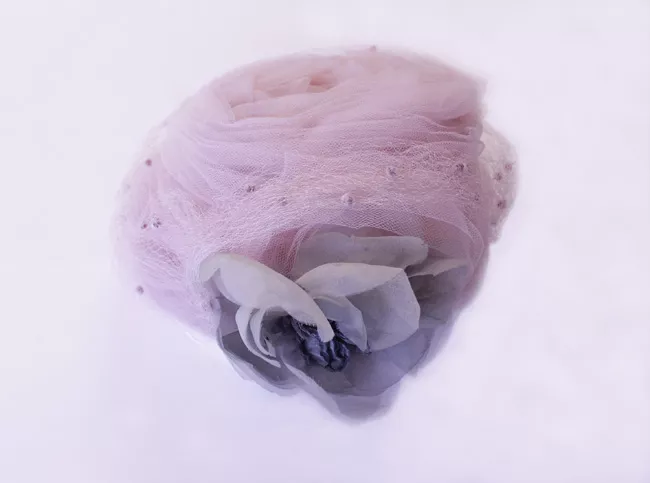 Tapado de niña confeccionado en encaje color marfil, con cuello amplio que forma una especie de capa, mangas largas con puño y forrado con raso color rosado.