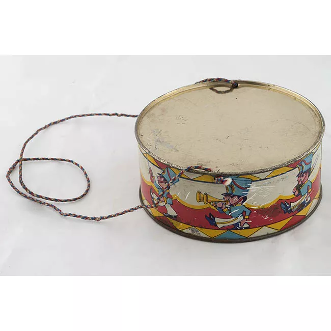 Objeto de uso infantil. Pieza de cartón rectangular de color beige y decorada por dos figuras de perfil de cuerpo entero y de pie. La de sector derecho viste de payaso, cuelga del bolsillo cadena de cecinas. Tiene sus manos extendidas, unidas a la de la otra figura, antropomorfa masculina, que se atavía de traje azul. De fondo, dos vitrinas de tiendas: farmacia y carnicería.
