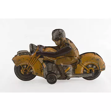 Objeto de uso recreativo, juguete de automóvil de madera pintada marrón, blanco y verde. Se compone por una estructura rectangular de interior vacío en la parte frontal una figura animal con dos patas y bozal roja. Se erige sobre tres ruedas de madera, dos trasera de mayor tamaño que la delantera
