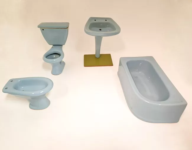 Conjunto a escala de cuatro piezas de cerámica de color celeste y esma...