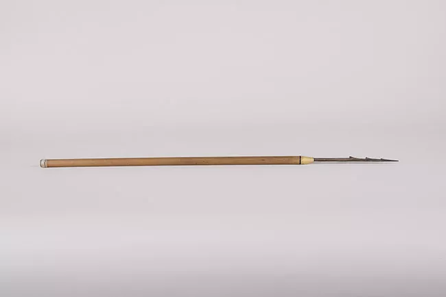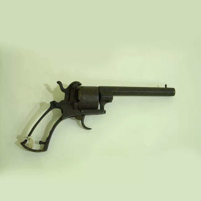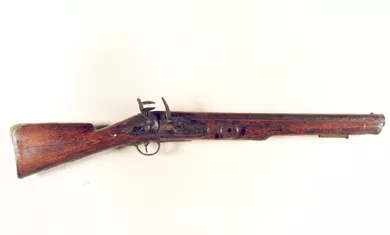 Fusil fabricado en madera de color marrón, con cañón de acero, con mecanismo de fulminante y cañón de ánima lisa. Lleva grabado un "57 H 1858" junto al percutor.