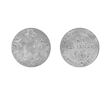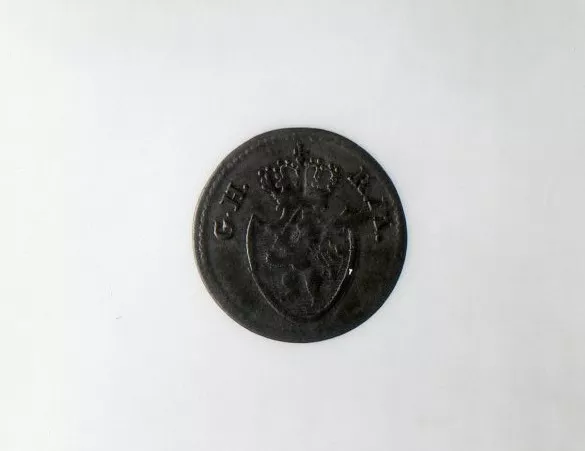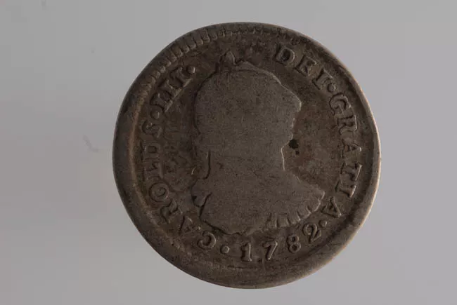 Objeto metálico de forma circular. Por el anverso representa un busto de perfil hacia la derecha y leyenda circundante, borroso y con mancha oscura. Por el reverso representa un escudo rodeado por leyenda.