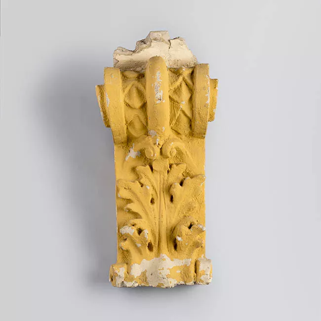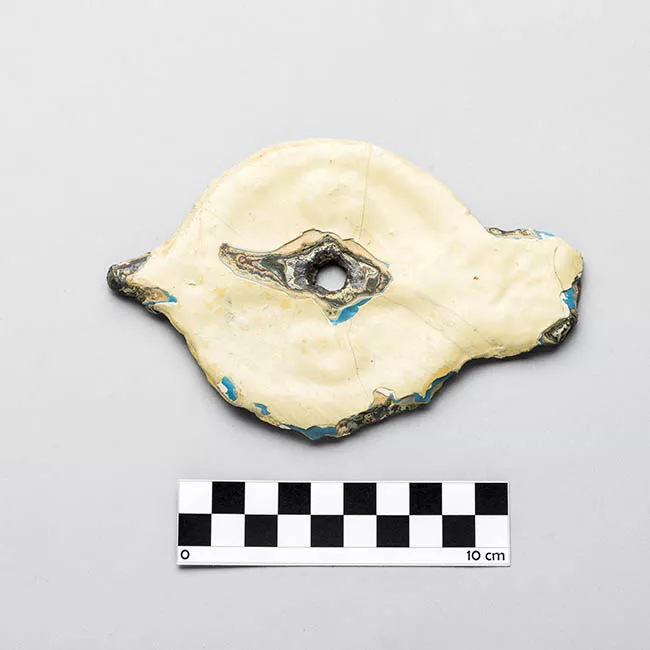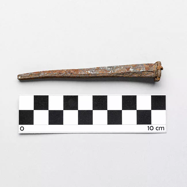Implemento usado para fijar otros elementos estructurales. Objeto de forma trapezoidal alargada ligeramente más ancho en el sector proximal y apuntado en el extremo distal. Fabricado en fragua.