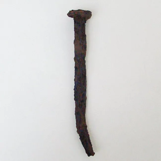 Implemento usado para fijar otros elementos estructurales. Objeto de forma trapezoidal alargada ligeramente más ancho en el sector proximal y apuntado en el extremo distal. Fabricado en fragua.