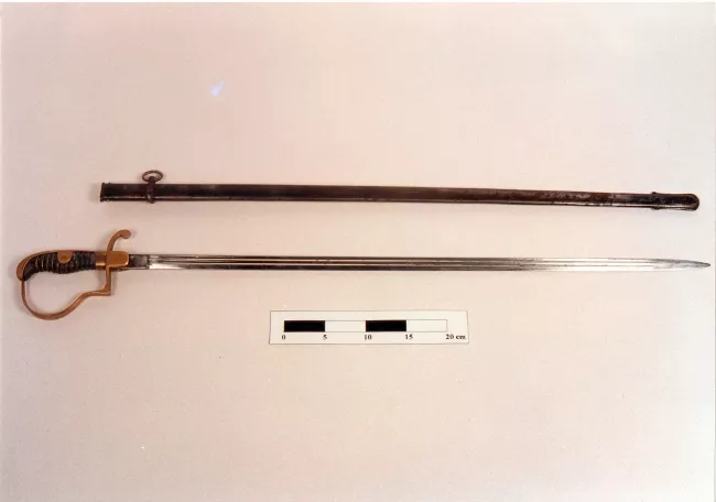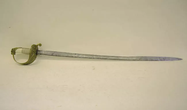 Arma blanca cortopunzante usada para ser montada en un arma de fuego, compuesta de empuñadura, hoja y vaina. La empuñadura tiene una guarda con un anillo para encajar en la boca de un fusil y un gavilán dirigido hacia atrás, el anillo tiene una muesca cuadrada; En el pomo tiene una acanaladura con un calzo para un muelle con un seguro, el que está ausente.