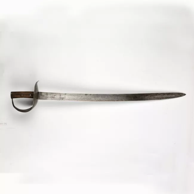 Arma blanca cortopunzante de mano, compuesta de empuñadura, guardamano y hoja. La empuñadura es de acero con puño de madera forrado en cuero, con un pomo de acero liso y redondeado, con una monterilla que se proyecta hacia adelante, donde se fija al puño por medio de una virola y dos aletas que tienen un remache pasante. El guardamano es del tipo "de estribo", formado por una pletina que sale del pomo formando una curva que se torna recta para doblarse en 90° y formar una guarda perpendicular a la hoja. Esta guarda está rematada en un gavilán ligeramente curvado hacia adelante; el guardamano tiene un ojal para anudar una dragona.