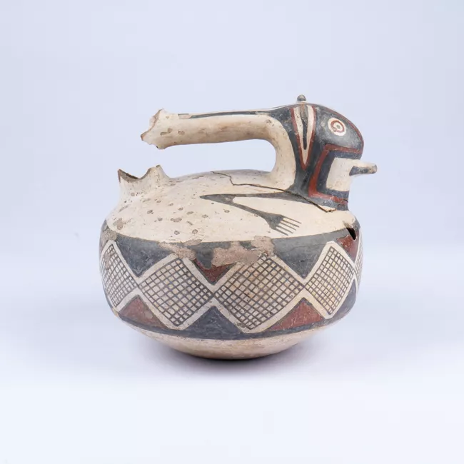 Contenedor de perfil compuesto y cuerpo globular de base plana. cuello hiperboloide y borde evertido. Presenta asa gran vertical de sección plana. Superficie engobada de color blanco con decoración en color negro y rojo con varios campos de diseño que incluyen motivos como clepsidras, líneas con hileras de puntos, hileras de ganchos e hileras de triángulos