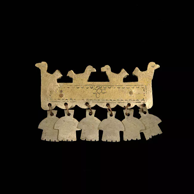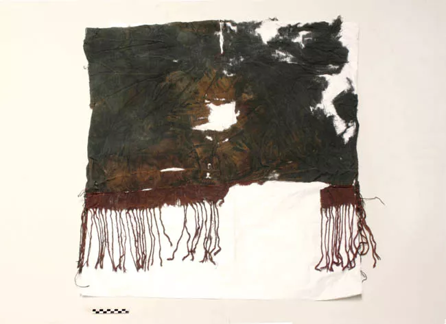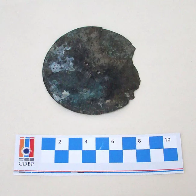 Fragmento circular de metal color oscuro con manchas verdosas y blanca...