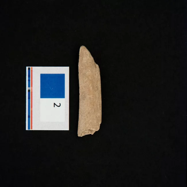 Contenedor de forma cilíndrica con un extremo apuntado, elaborado en valva de molusco (Semele solida), pulida intencionalmente en el borde. Color gris claro.