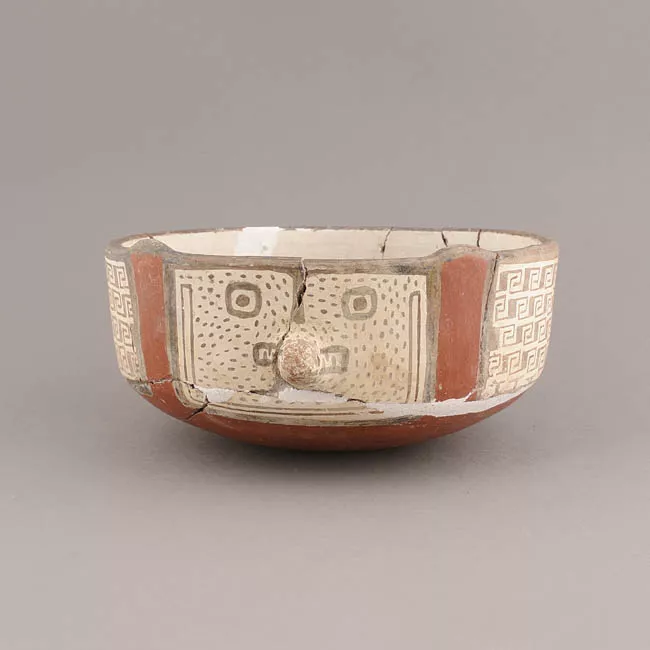 Arma que se usa para cazar. De forma ovoidal, con un extremo aguzado, trabajada en ambas caras y bordes. Color rojizo con manchas ocres. Tiene escrito "A.Piuquenes cuad.1 10A" color negro sobre blanco.