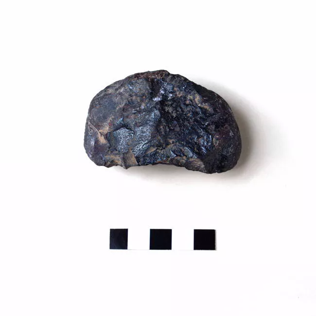 Quebrado a la mitad, de forma discoidal con superficie irregular, mas ...
