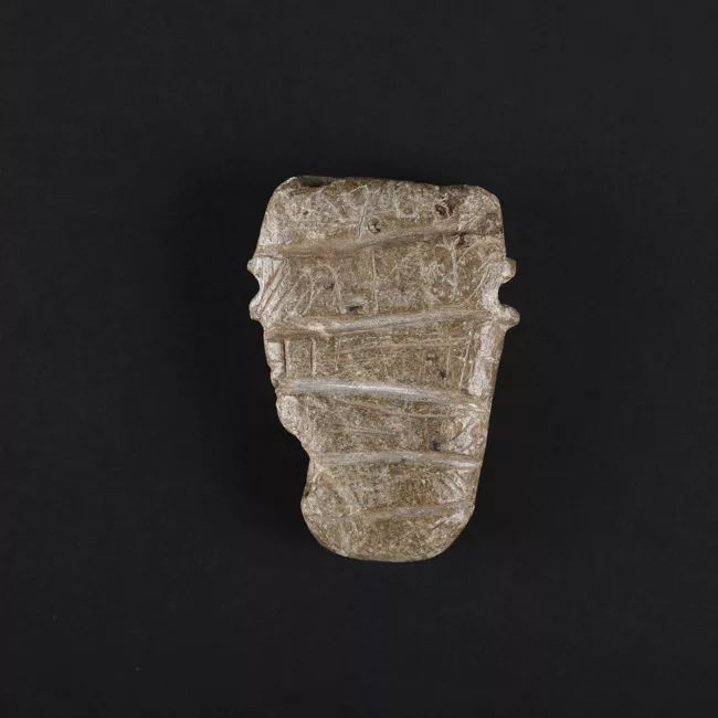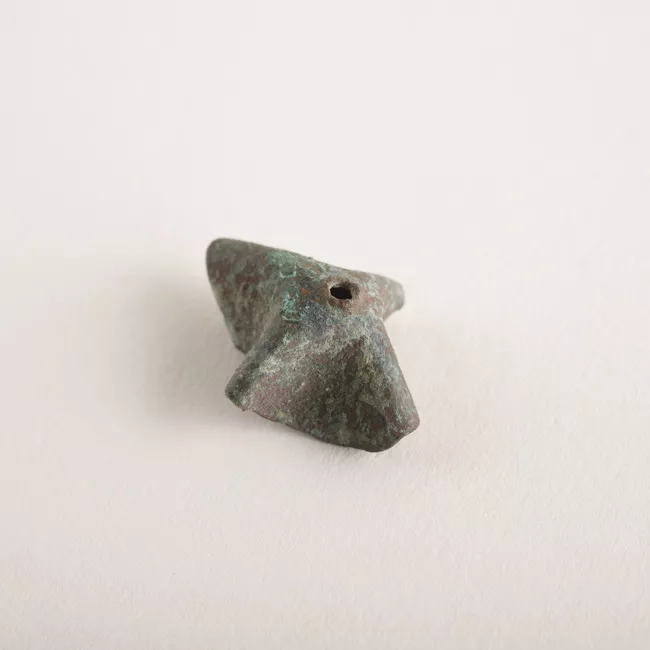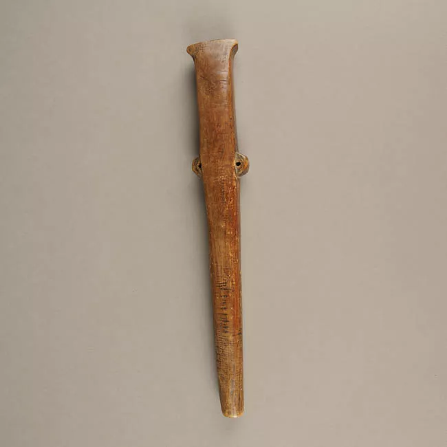 Instrumento musical de viento. Fabricado en cuerno. Posee una perforación y un tallado en el extremo. Color ocre y negro. Restos de tierra color rojo.
